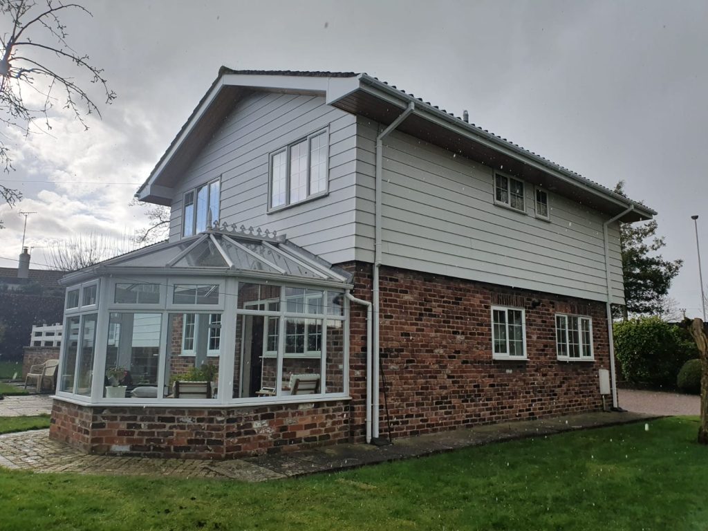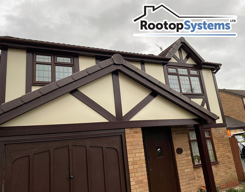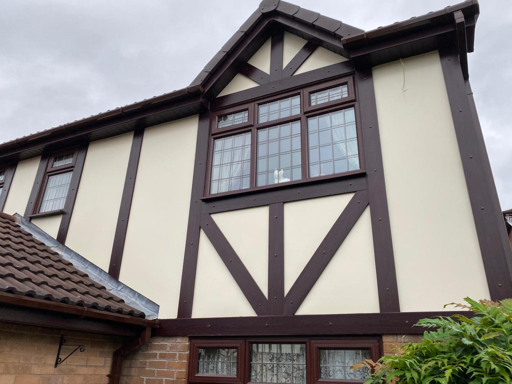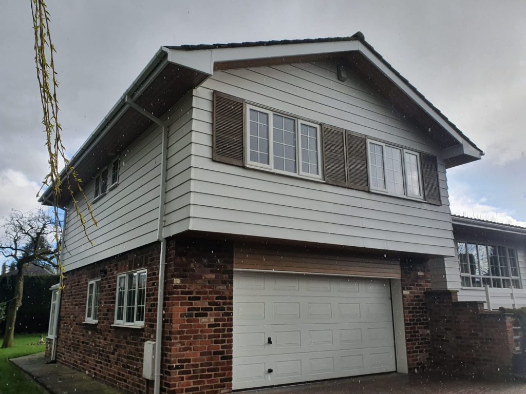 We have removed all the existing wooden Fascia, soffits, and cladding from this property and replaced it with brown PVC, with cream cladding and brown dry verge caps.
